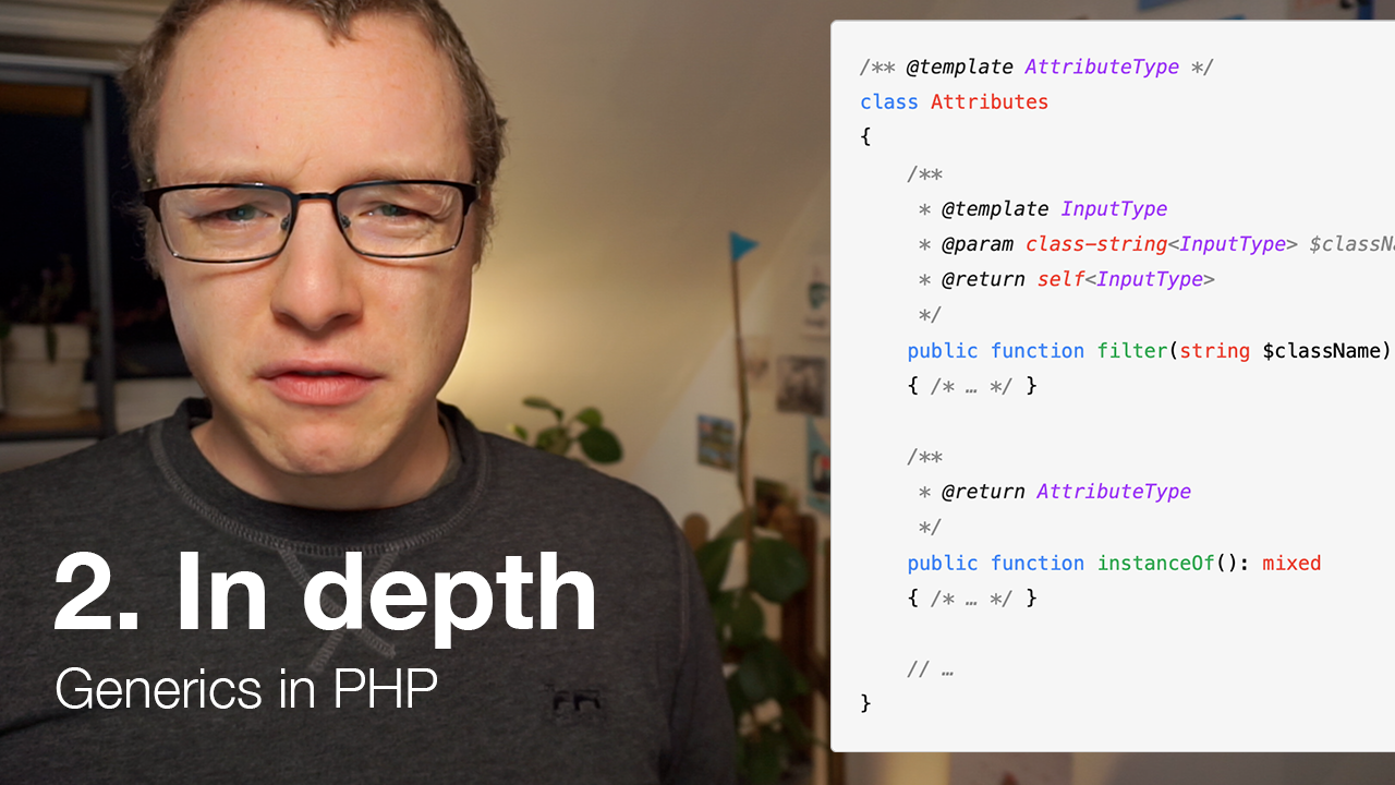 Second: doc blocks are, in my opinion, suboptimal. They feel like a less important part of our codebase. And granted: generic annotations only provide static insights and no runtime functionality, but we’ve seen how powerful static analysis can be, even without runtime type checks. I think it’s unfair to treat type information as “doc comments”, it doesn’t communicate the importance of those types within our code. That’s why we got attributes in PHP 8: all functionality that attributes provide, was already possible with docblock annotations, but that just didn’t feel good enough. The same goes for generics.